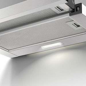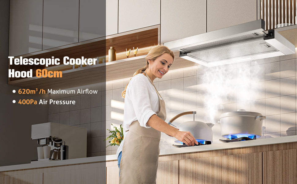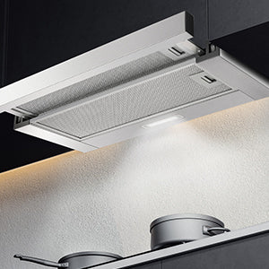 - Diese 60 cm breite, versenkbare Dunstabzugshaube kann beim Kochen herausgezogen und bei Nichtgebrauch verstaut werden. Sie kann platzsparend unter dem Schrank installiert werden.