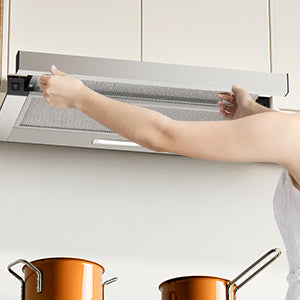 Versenkbarer Aluminiumfilter mit 3-lagigem Design, absorbiert und filtert effektiv alle Arten von Fett, Staub usw. Außerdem ist er abnehmbar und waschbar. Einfach zu demontieren, entfernen Sie einfach den Filter aus der Seitentaste, Handwäsche oder Spülmaschine reinigen.