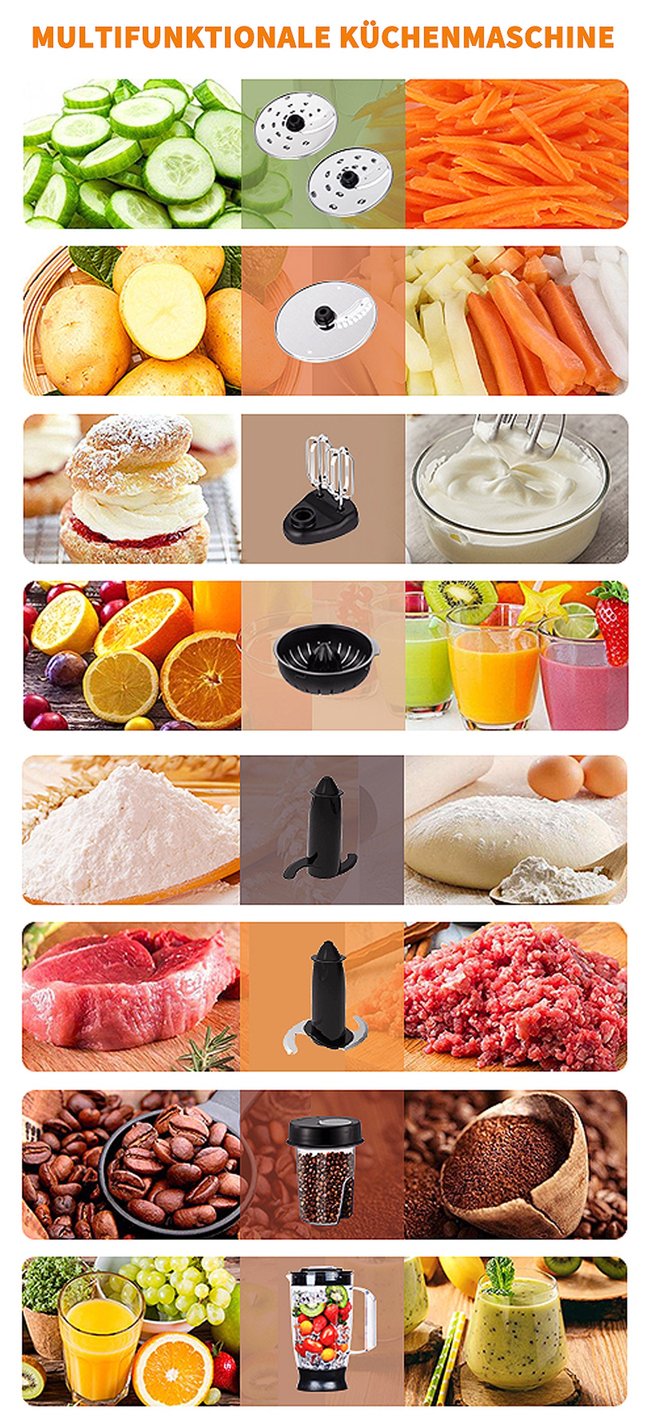 Die SNDOAS multifunktionale küchenmaschine wird mit verschiedenem Zubehör geliefert und damit kann man hacken, fein oder ausgiebig schneiden, mischen, entsaften, Schleifen, verquirlen und kneten. Sie können damit frische und gesunde Säfte, leckere Salate, Kuchen und Kekse und andere Köstlichkeiten zubereiten.