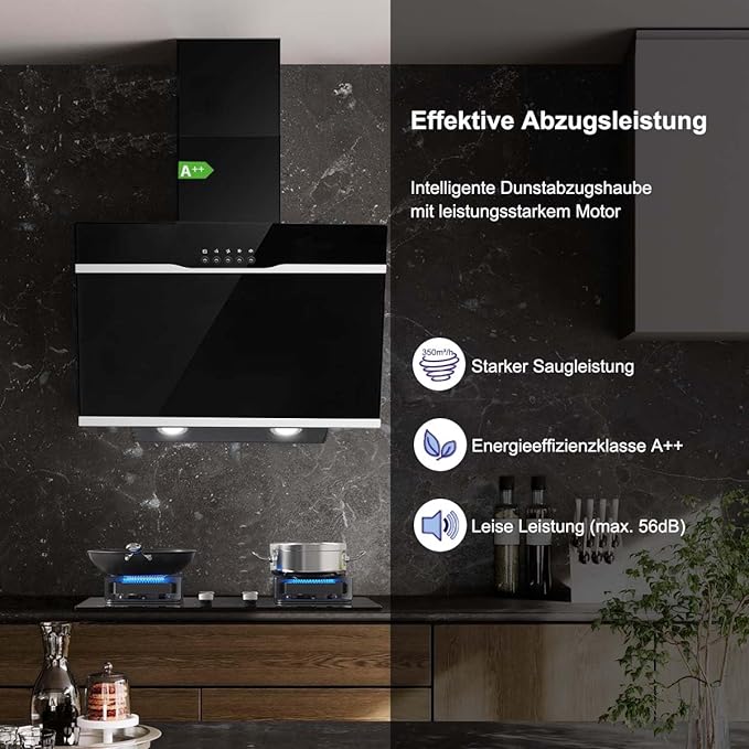 - Leistungsstark & Effizient: Das dunstabzugshauben ist mit einem Premium motor gewährleistet eine leise Leistung (max. 56dB) und Lange Lebensdauer. Die Energieeffizienzklasse A++ trägt zur Energieeinsparung, 350 m³/h Starker Saugleistung meine Küche schnell von Dampf, Gerüchen und Kochdünsten befreit wird.