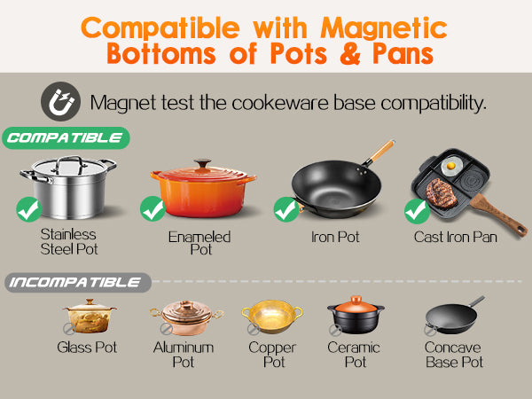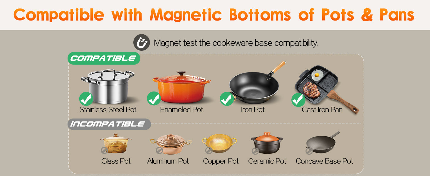 Geeignet für Edelstahl, emaillierte Töpfe und Pfannen, Töpfe und Pfannen aus Eisen, Töpfe und Pfannen aus Gusseisen. Nicht geeignet für Kochgeschirr aus: reinem Edelstahl, Aluminium, Kupfer, Glas, Holz, Porzellan, Keramik und Steingut. Achten Sie bitte darauf, dass der Boden Ihrer Pfanne glatt ist.