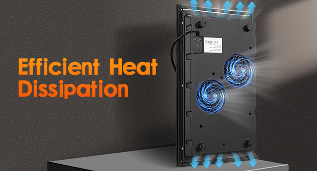 Der Boden ist mit einem Kühlgebläse und Kühlöffnungen an den Seiten ausgestattet, die die Temperatur des Gehäuses schnell reduzieren und die Lebensdauer des Induktionskochfelds verlängern können. Nach dem Kochen kann der Induktionsherd nicht sofort ausgeschaltet werden, der Kühlventilator muss noch einige Minuten laufen, um das Innere des Induktionsherdes abzukühlen.