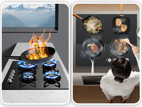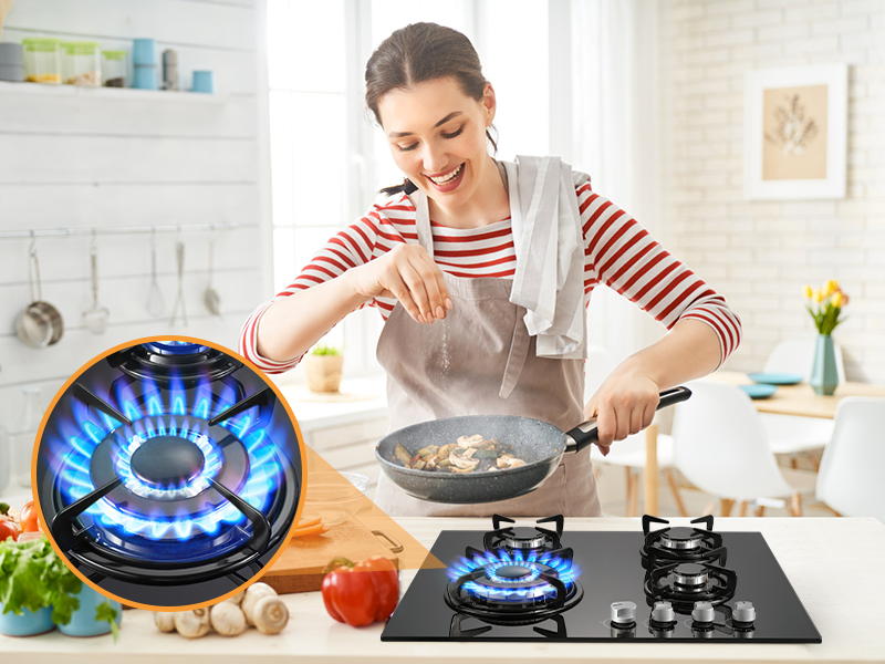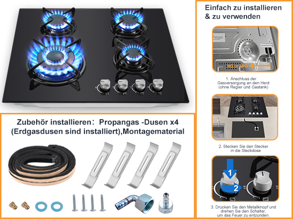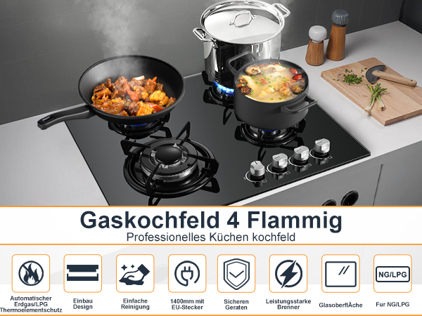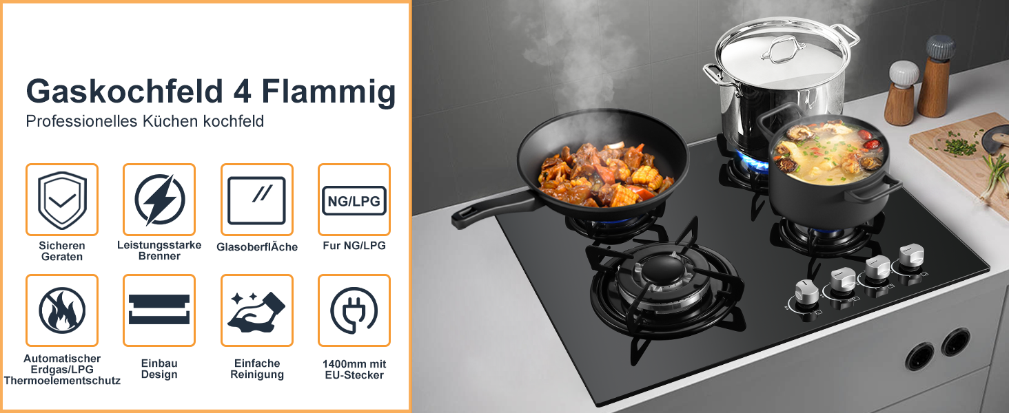Mit den 4 leistungsstarken Brennern können Sie mühelos bis zu 4 Gerichte gleichzeitig zubereiten und kochen, was die Kochzeit erheblich verkürzt.