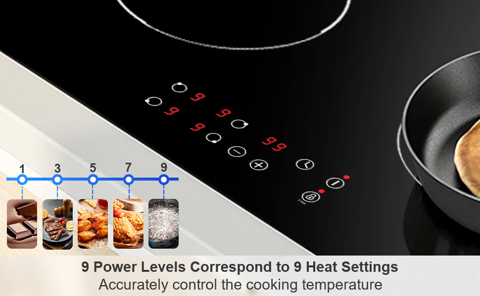 Die 9 Leistungsstufen passen sich Ihren unterschiedlichen Kochbedürfnissen an. Mit der sensiblen Touch-Bedienung erfüllt er alle Ihre Bedürfnisse bei allen Kochvorgängen, wie z.B. Kochen, Schmoren, Braten, Rühren und Rösten. Das Kochfelder erhitzt die Speisen gleichmäßiger und verhindert das Anbrennen von Töpfen, Pfannen und Lebensmitteln.