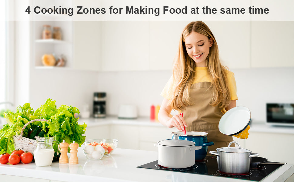 Ultradünnes Design, Dicke ist nur 5cm, Produktgröße ist 59*52cm, kompakte Größe. 4 Kochzonen können unabhängig voneinander gesteuert werden, Sie können 4 Töpfe aufstellen, um Speisen gleichzeitig zu kochen, was Ihnen eine Menge Kochzeit spart.