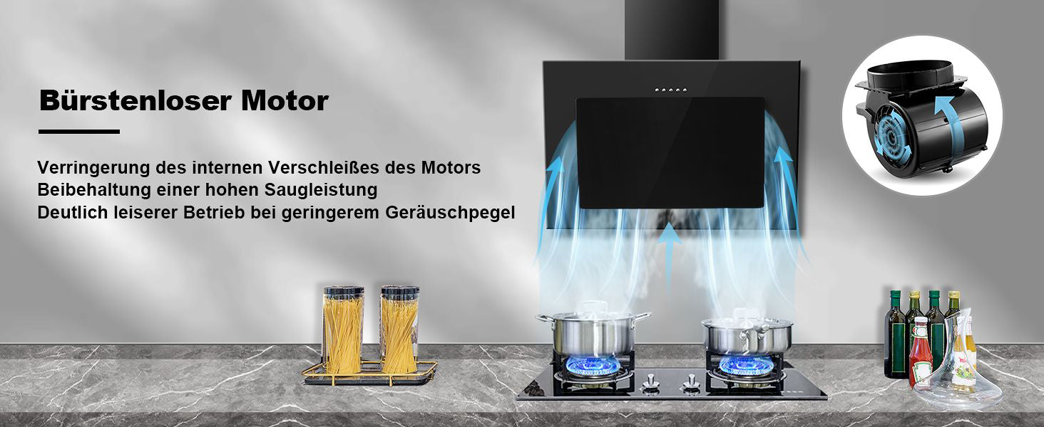 Die bürstenlose Dunstabzugshaube hat einen maximalen Geräuschpegel von unter 55 dB und sorgt so für eine ruhige und angenehme Kochumgebung.