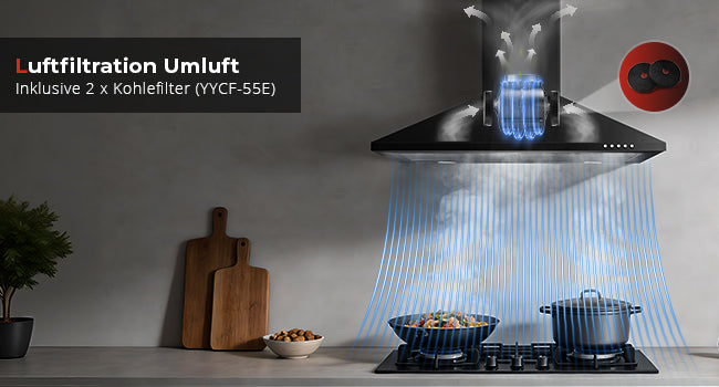Mit zwei Kohlefiltern, die die Luft reinigen, bevor sie wieder in den Raum zurückgeführt wird. Besonders nützlich, wenn Sie in einem Apartment oder einer Eigentumswohnung leben. Ein regelmäßiger Austausch der Kohlefilter gewährleistet eine optimale Leistung des Küchenlüfters (Code # YYCF-55E).