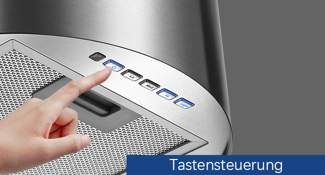 Intuitive Knopfsteuerung – durch einfachen Druck wird Küchendampf effizient abgeführt. Entwickelt für Küchen mit Gas-, Induktions- oder Keramikherden.
